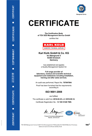 حصلت كارل كولب مؤخرا على شهادة الايزو 9001:2008 وهي نافذة حتى ايلول / سبتمبر 2018 . لقد تم تدقيق واصدار شهادة منظومة ادارة الجودة هذه من قبل هيئة اصدار الشهادات تي يو في سود وهي تشمل كامل المنتجات والخدمات التي تتعامل بها كارل كولب: " المجهز الذي يجهز كافة اجهزة المختبرات والاجهزة الطبية والعلمية التكنولوجية ويجهز بها كافة المؤسسات وما يتبعها من خدمات التنصيب والتدريب ومابعد البيع".
